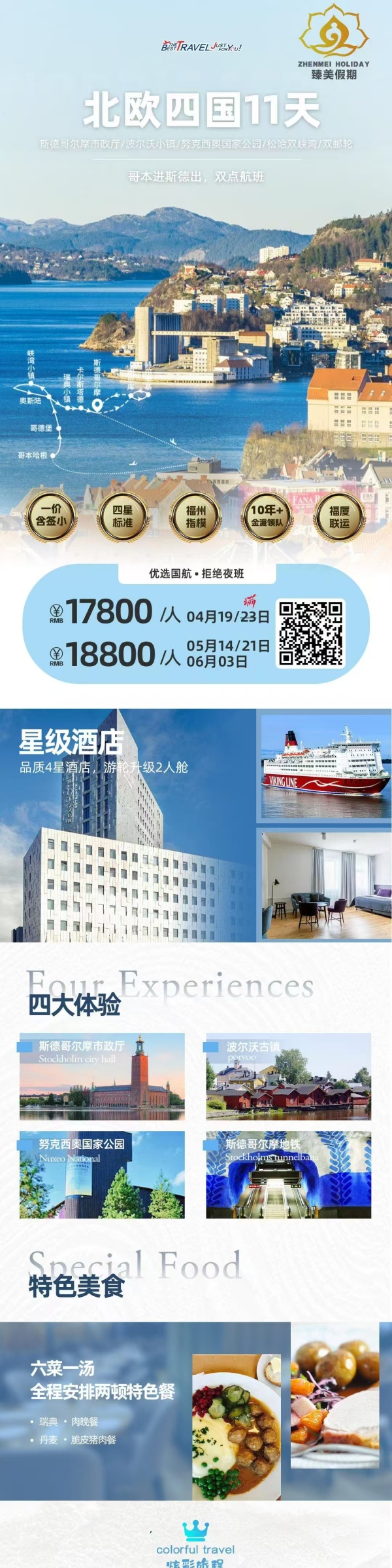 5.行程中所列包含的午晚餐以中式餐食为主,北欧段六菜一汤,不能安排中式餐食的以西式三道式或自助替代;签证相关的例如未成年人公证,认证等相关费用;6.行程中所列入内景点的首道门票及讲解服务费;